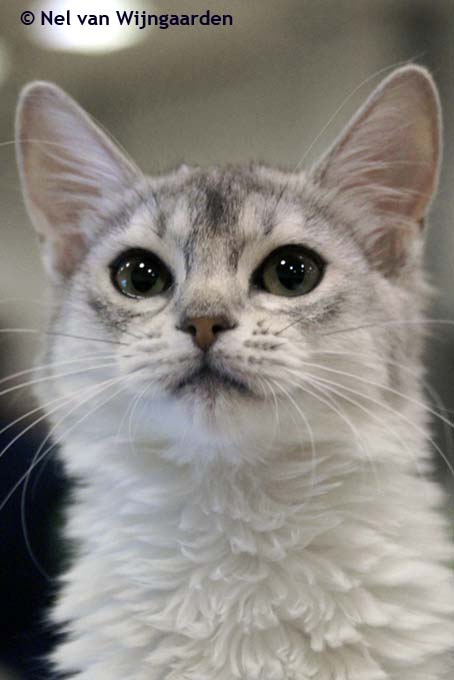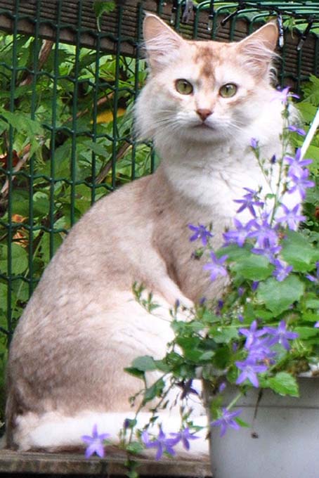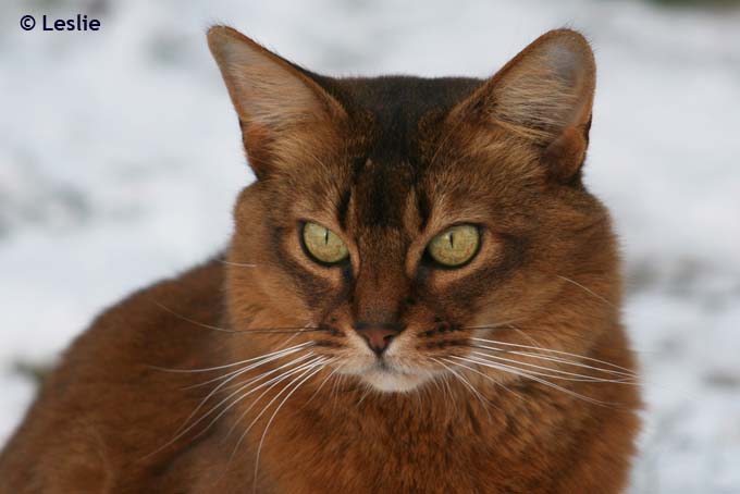 Opmerkelijk is dat de Abessijnen en Somali’s over een schutkleur schijnen te beschikken. Ik bedoel daarmee, dat omgeving en licht een grote invloed op hun verschijningsvorm hebben. Ze kunnen als het ware van kleur veranderen. Er stond eens een buurmeisje bij mij voor de deur en riep: “Die groene kat van jou zit in onze tuin!” En het was waar: mijn wildkleur Abessijn leek op het grote gazon groen.